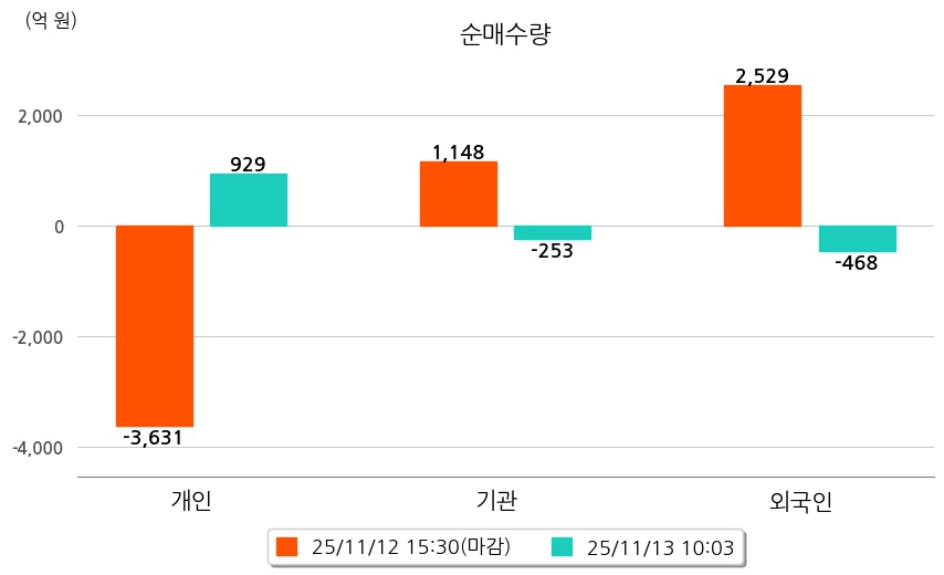 투자자별 동향을 살펴보면 기관은 253억 원 순매도했으며, 외국인은 468억 원 순매도했다. 개인은 929억 원 순매수했다.