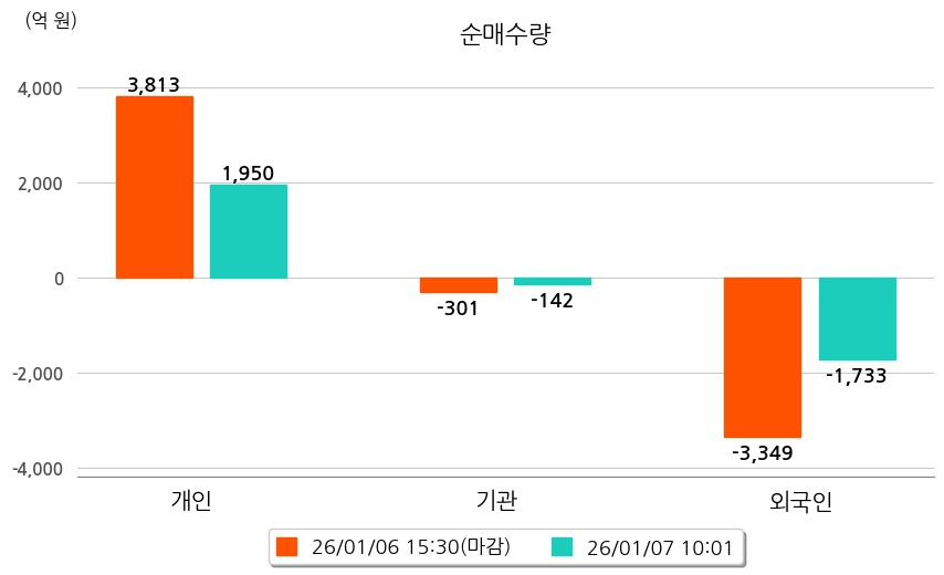 투자자별 동향을 살펴보면 기관은 142억 원 순매도했으며, 외국인은 1,733억 원 순매도했다. 개인은 1,950억 원 순매수했다.