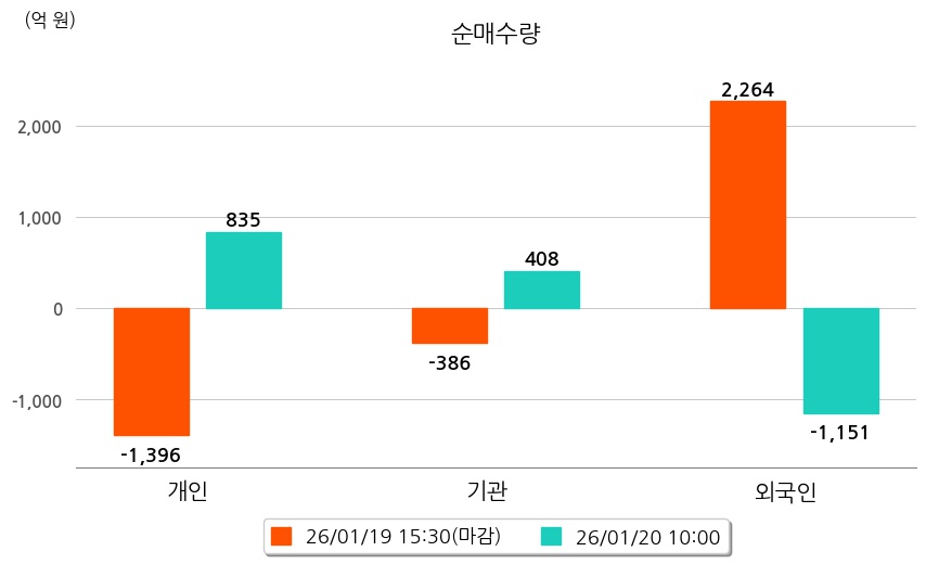 투자자별 동향을 살펴보면 기관은 408억 원 순매수했으며, 외국인은 1,151억 원 순매도했다. 개인은 835억 원 순매수했다.