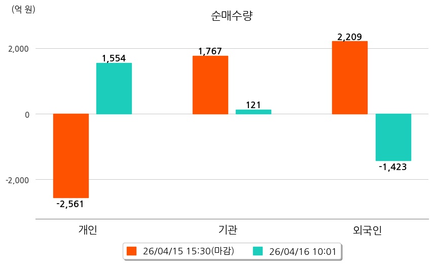 투자자별 동향을 살펴보면 기관은 121억 원 순매수했으며, 외국인은 1,423억 원 순매도했다. 개인은 1,554억 원 순매수했다.