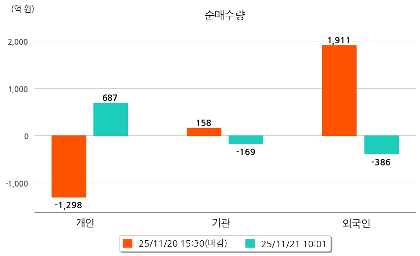 투자자별 동향을 살펴보면 기관은 169억 원 순매도했으며, 외국인은 386억 원 순매도했다. 개인은 687억 원 순매수했다.