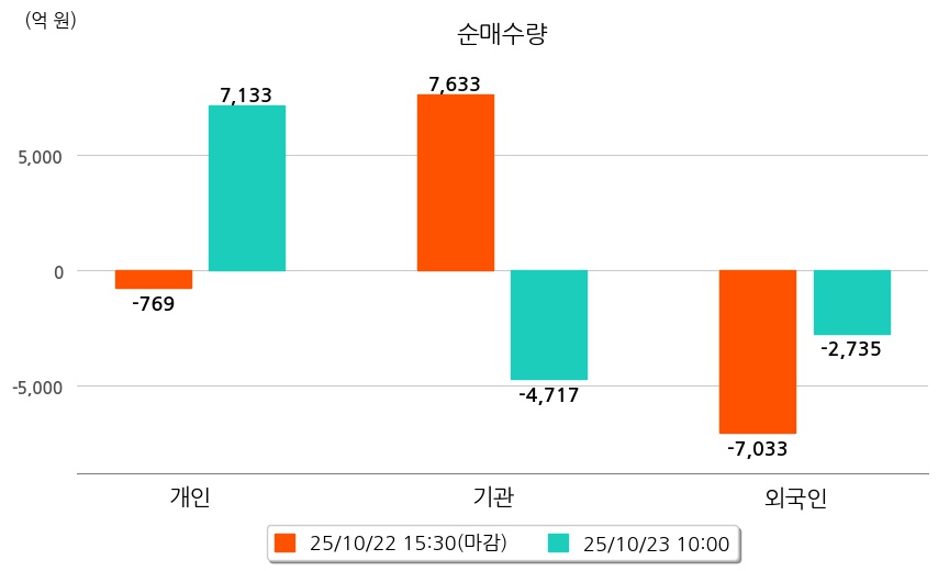 투자자별 동향을 살펴보면 기관은 4,717억 원 순매도했으며, 외국인은 2,735억 원 순매도했다. 개인은 7,133억 원 순매수했다.
