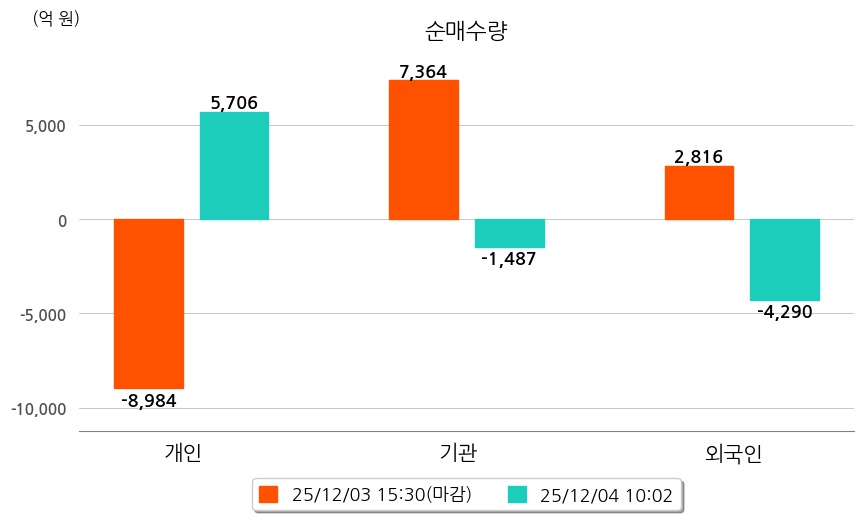 투자자별 동향을 살펴보면 기관은 1,487억 원 순매도했으며, 외국인은 4,290억 원 순매도했다. 개인은 5,706억 원 순매수했다.