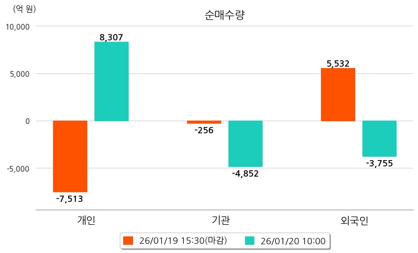 투자자별 동향을 살펴보면 기관은 4,852억 원 순매도했으며, 외국인은 3,755억 원 순매도했다. 개인은 8,307억 원 순매수했다.