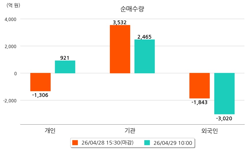 투자자별 동향을 살펴보면 기관은 2,465억 원 순매수했으며, 외국인은 3,020억 원 순매도했다. 개인은 921억 원 순매수했다.