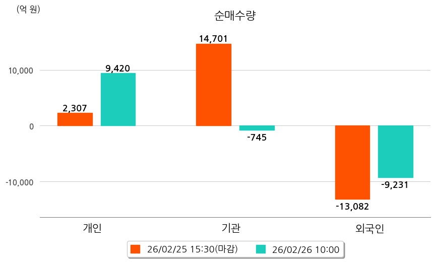 투자자별 동향을 살펴보면 기관은 745억 원 순매도했으며, 외국인은 9,231억 원 순매도했다. 개인은 9,420억 원 순매수했다.