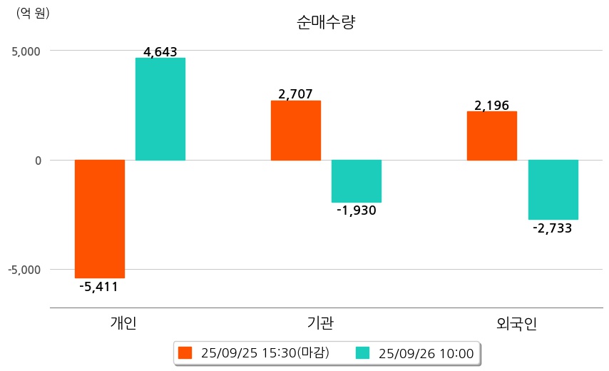 투자자별 동향을 살펴보면 기관은 1,930억 원 순매도했으며, 외국인은 2,733억 원 순매도했다. 개인은 4,643억 원 순매수했다.