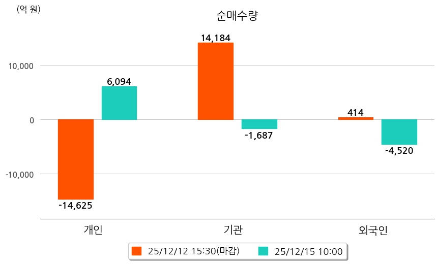 투자자별 동향을 살펴보면 기관은 1,687억 원 순매도했으며, 외국인은 4,520억 원 순매도했다. 개인은 6,094억 원 순매수했다.