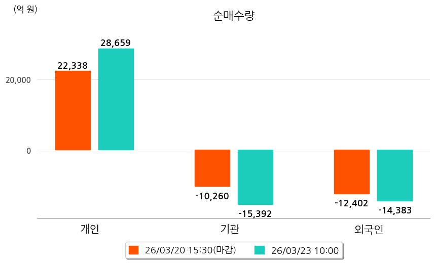 투자자별 동향을 살펴보면 기관은 15,392억 원 순매도했으며, 외국인은 14,383억 원 순매도했다. 개인은 28,659억 원 순매수했다.