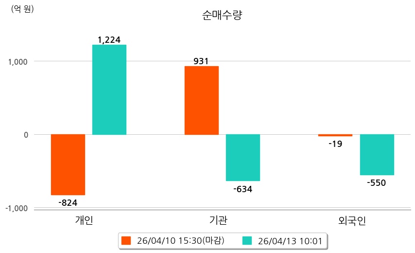 투자자별 동향을 살펴보면 기관은 634억 원 순매도했으며, 외국인은 550억 원 순매도했다. 개인은 1,224억 원 순매수했다.