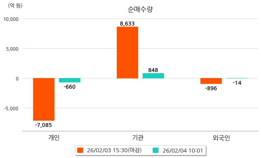 투자자별 동향을 살펴보면 기관은 848억 원 순매수했으며, 외국인은 14억 원 순매도했다. 개인은 660억 원 순매도했다.