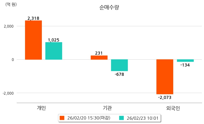투자자별 동향을 살펴보면 기관은 678억 원 순매도했으며, 외국인은 134억 원 순매도했다. 개인은 1,025억 원 순매수했다.