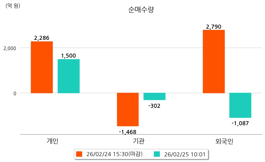 투자자별 동향을 살펴보면 기관은 302억 원 순매도했으며, 외국인은 1,087억 원 순매도했다. 개인은 1,500억 원 순매수했다.