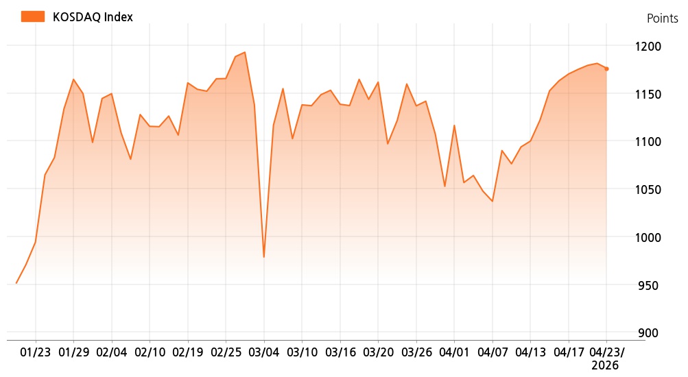 23일 오전 10시 코스닥(1,176.04p, 5.08p, -0.43%)는 외국인 매도가 늘면서 하락세를 보이고 있다.