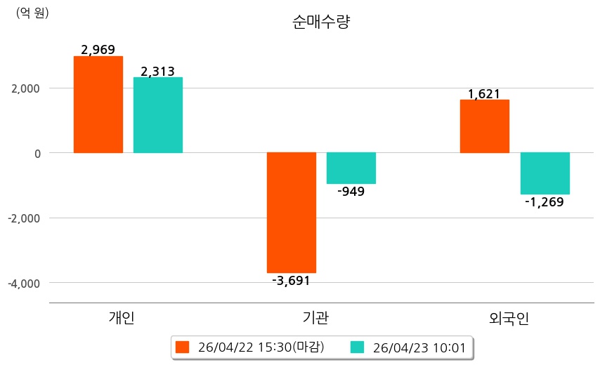 투자자별 동향을 살펴보면 기관은 949억 원 순매도했으며, 외국인은 1,269억 원 순매도했다. 개인은 2,313억 원 순매수했다.