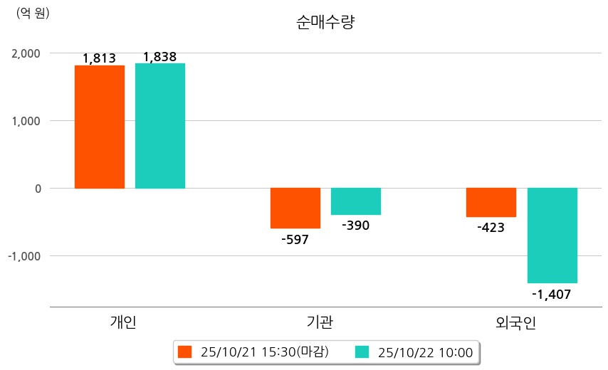 투자자별 동향을 살펴보면 기관은 390억 원 순매도했으며, 외국인은 1,407억 원 순매도했다. 개인은 1,838억 원 순매수했다.