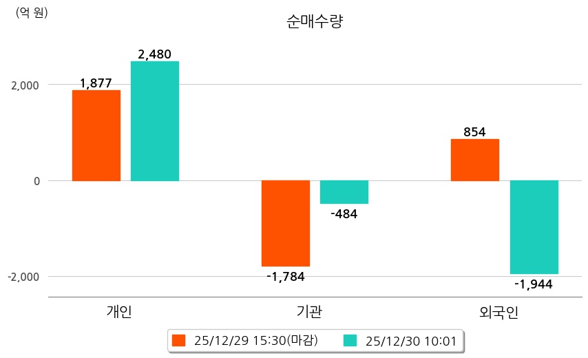 투자자별 동향을 살펴보면 기관은 484억 원 순매도했으며, 외국인은 1,944억 원 순매도했다. 개인은 2,480억 원 순매수했다.