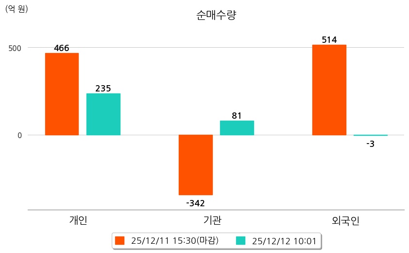 투자자별 동향을 살펴보면 기관은 81억 원 순매수했으며, 외국인은 3억 원 순매도했다. 개인은 235억 원 순매수했다.
