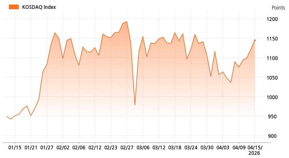 15일 오전 10시 코스닥(1,145.08p, 23.20p, +2.07%)는 개인 매수가 늘면서 상승세를 보이고 있다.