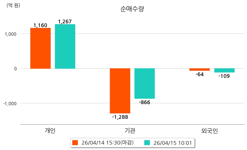 투자자별 동향을 살펴보면 기관은 866억 원 순매도했으며, 외국인은 109억 원 순매도했다. 개인은 1,267억 원 순매수했다.