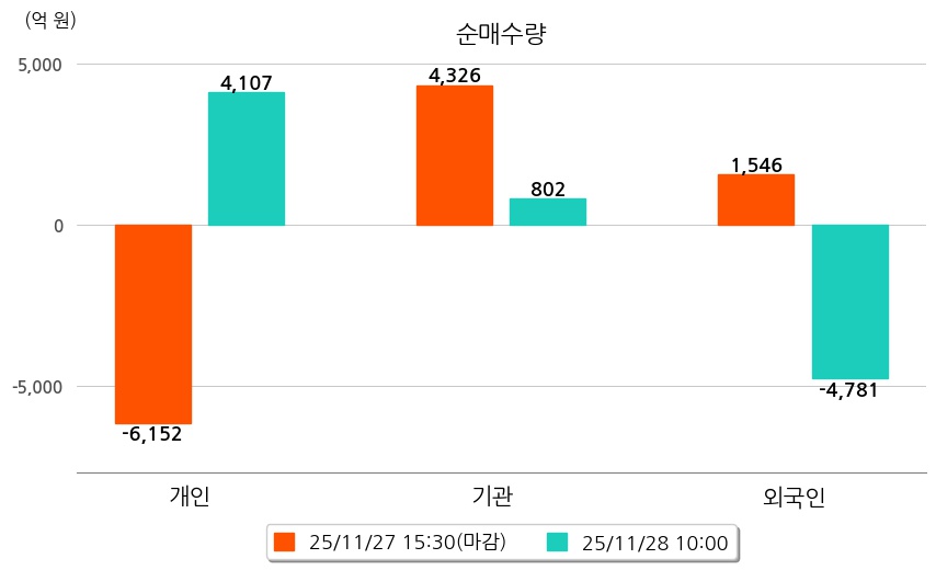 투자자별 동향을 살펴보면 기관은 802억 원 순매수했으며, 외국인은 4,781억 원 순매도했다. 개인은 4,107억 원 순매수했다.