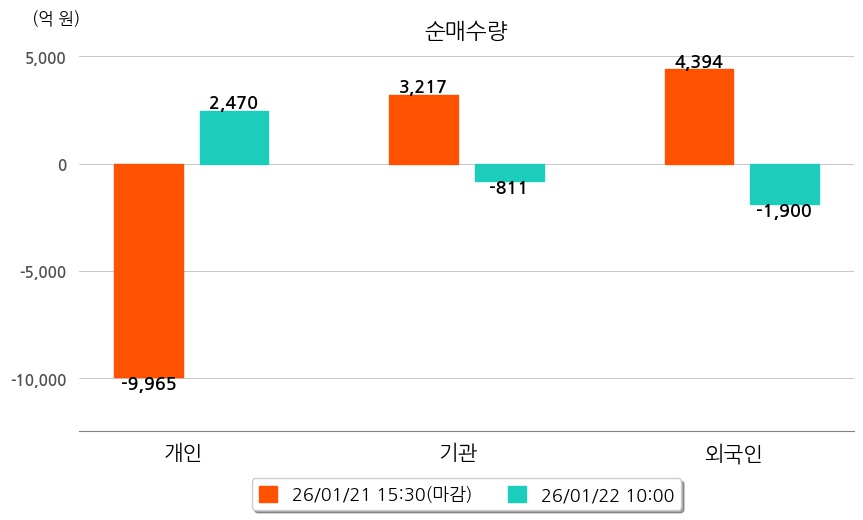 투자자별 동향을 살펴보면 기관은 811억 원 순매도했으며, 외국인은 1,900억 원 순매도했다. 개인은 2,470억 원 순매수했다.