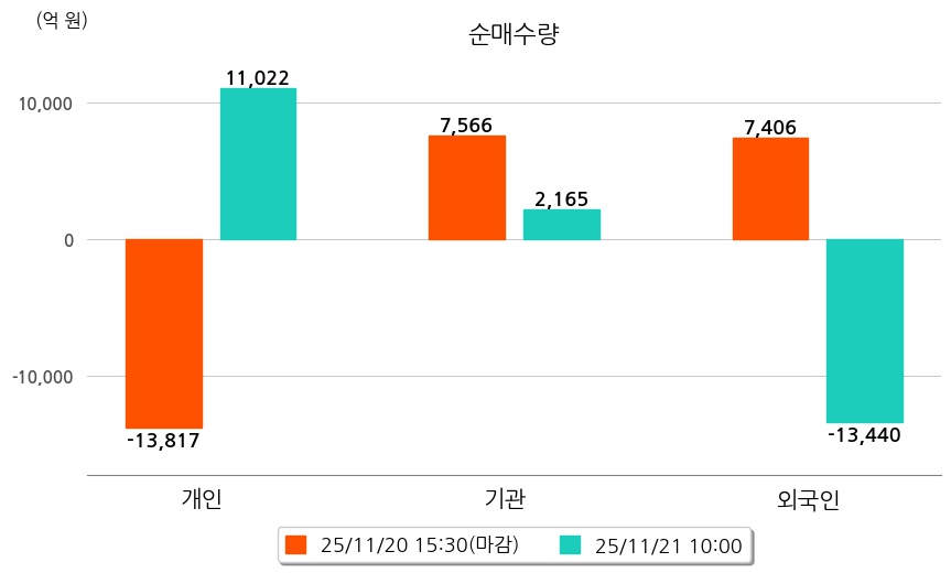 투자자별 동향을 살펴보면 기관은 2,165억 원 순매수했으며, 외국인은 13,440억 원 순매도했다. 개인은 11,022억 원 순매수했다.