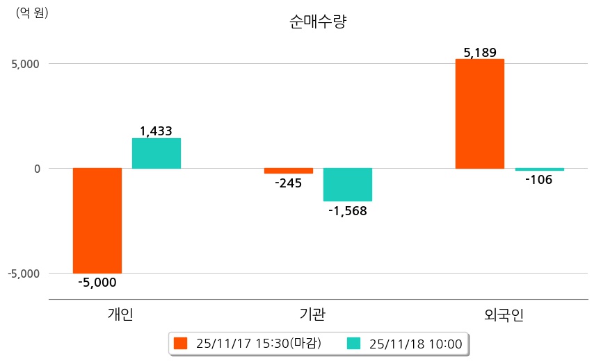 투자자별 동향을 살펴보면 기관은 1,568억 원 순매도했으며, 외국인은 106억 원 순매도했다. 개인은 1,433억 원 순매수했다.