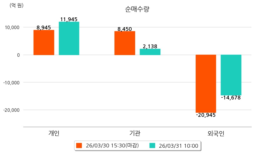 투자자별 동향을 살펴보면 기관은 2,138억 원 순매수했으며, 외국인은 14,678억 원 순매도했다. 개인은 11,945억 원 순매수했다.