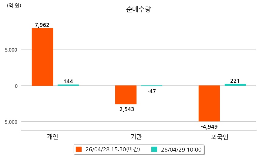 투자자별 동향을 살펴보면 기관은 47억 원 순매도했으며, 외국인은 221억 원 순매수했다. 개인은 144억 원 순매수했다.