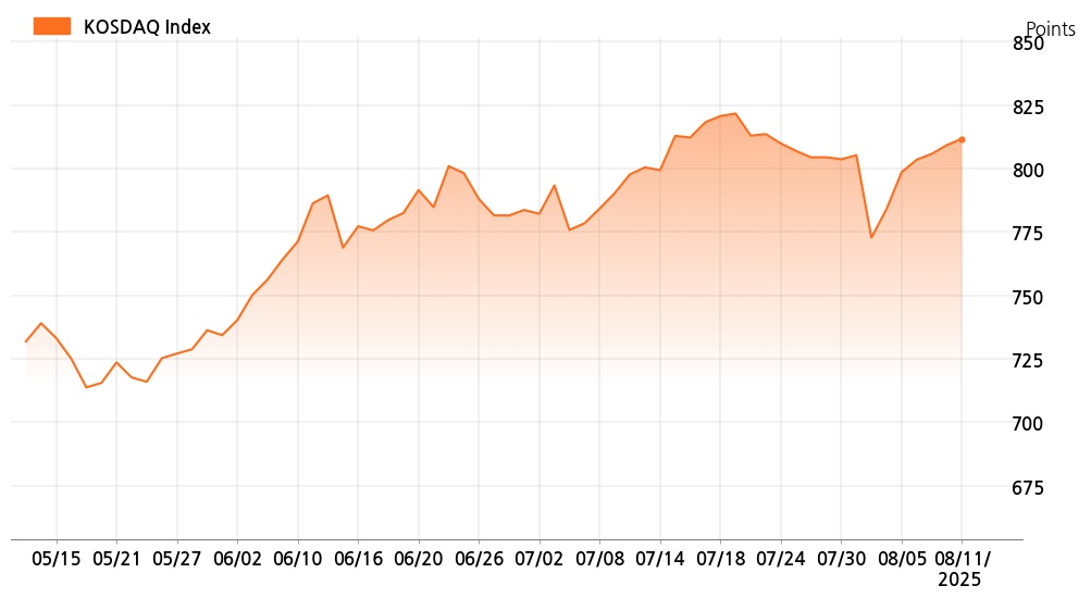 11일 오전 10시 코스닥(811.77p, 2.50p, +0.31%)는 기관 매수가 늘면서 상승세를 보이고 있다.