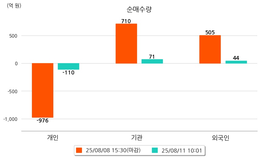 투자자별 동향을 살펴보면 기관은 71억 원 순매수했으며, 외국인은 44억 원 순매수했다. 개인은 110억 원 순매도했다.