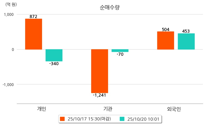 투자자별 동향을 살펴보면 기관은 70억 원 순매도했으며, 외국인은 453억 원 순매수했다. 개인은 340억 원 순매도했다.