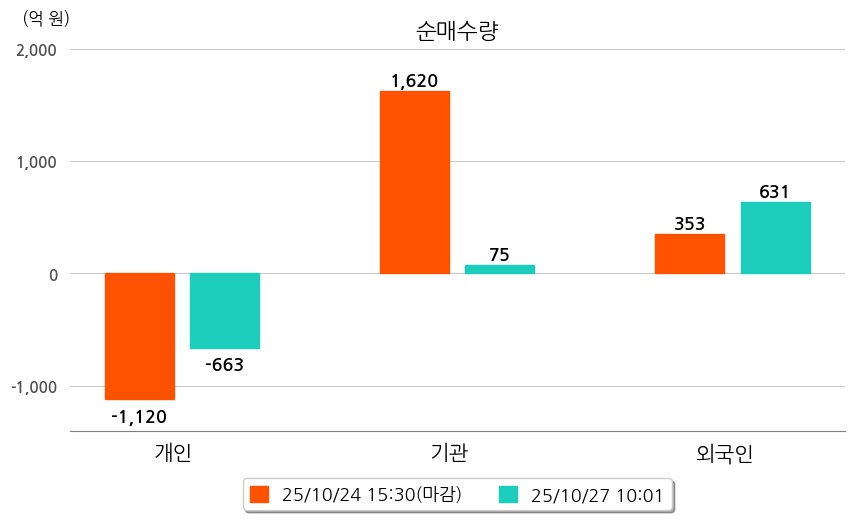 투자자별 동향을 살펴보면 기관은 75억 원 순매수했으며, 외국인은 631억 원 순매수했다. 개인은 663억 원 순매도했다.