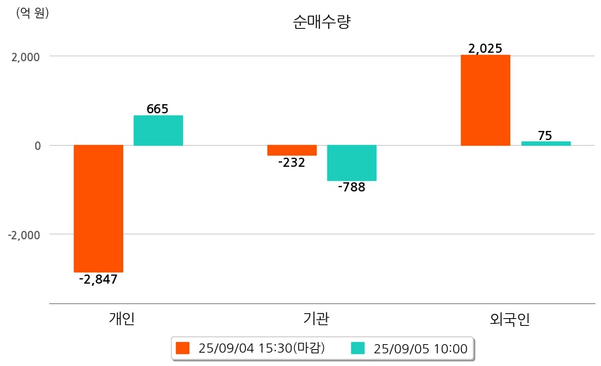 투자자별 동향을 살펴보면 기관은 788억 원 순매도했으며, 외국인은 75억 원 순매수했다. 개인은 665억 원 순매수했다.