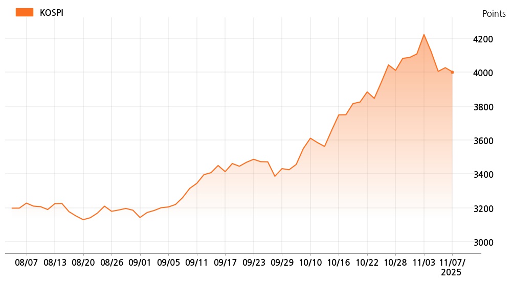 7일 오전 10시 코스피(4,002.04p, 24.41p, -0.61%)는 개인 매도가 늘면서 하락세를 보이고 있다.