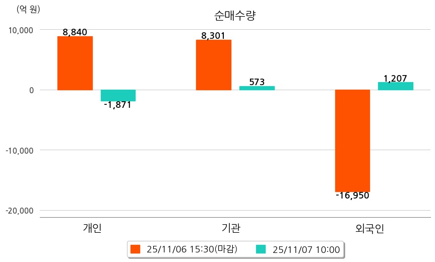 투자자별 동향을 살펴보면 기관은 573억 원 순매수했으며, 외국인은 1,207억 원 순매수했다. 개인은 1,871억 원 순매도했다.