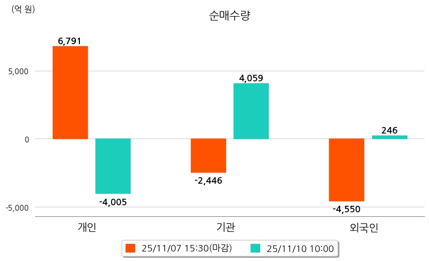 투자자별 동향을 살펴보면 기관은 4,059억 원 순매수했으며, 외국인은 246억 원 순매수했다. 개인은 4,005억 원 순매도했다.