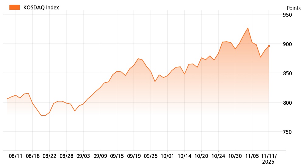 11일 오전 10시 코스닥(896.25p, 7.90p, +0.89%)는 외국인 매수가 늘면서 상승세를 보이고 있다.