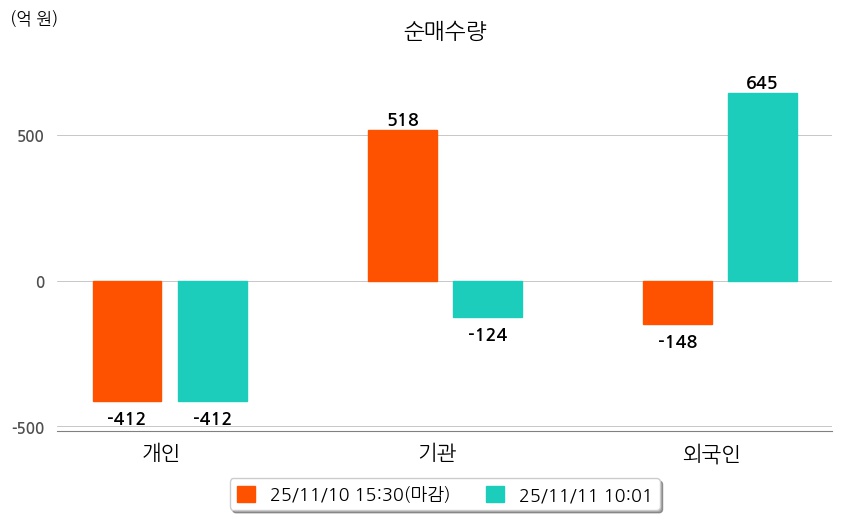 투자자별 동향을 살펴보면 기관은 124억 원 순매도했으며, 외국인은 645억 원 순매수했다. 개인은 412억 원 순매도했다.