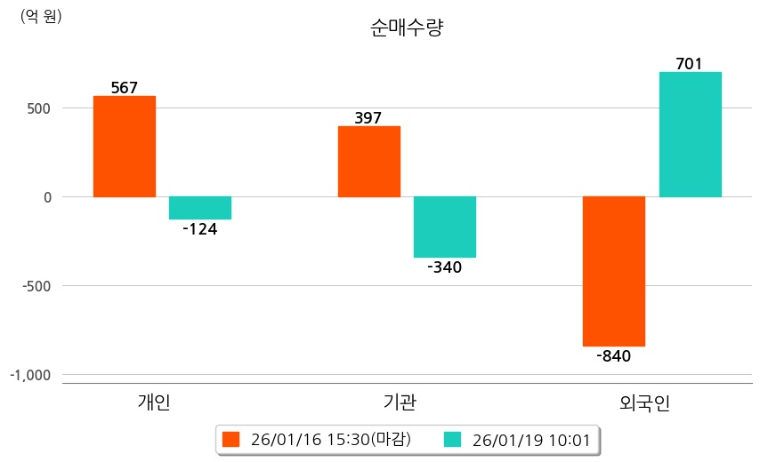 투자자별 동향을 살펴보면 기관은 340억 원 순매도했으며, 외국인은 701억 원 순매수했다. 개인은 124억 원 순매도했다.