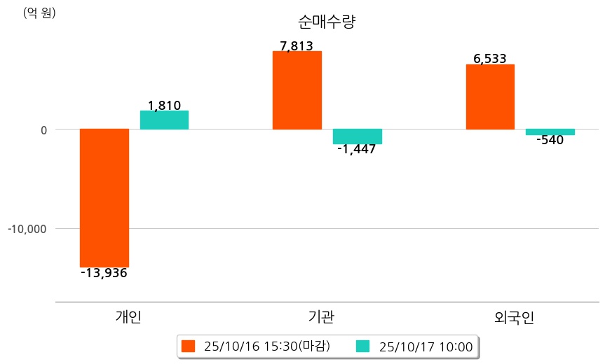 투자자별 동향을 살펴보면 기관은 1,447억 원 순매도했으며, 외국인은 540억 원 순매도했다. 개인은 1,810억 원 순매수했다.