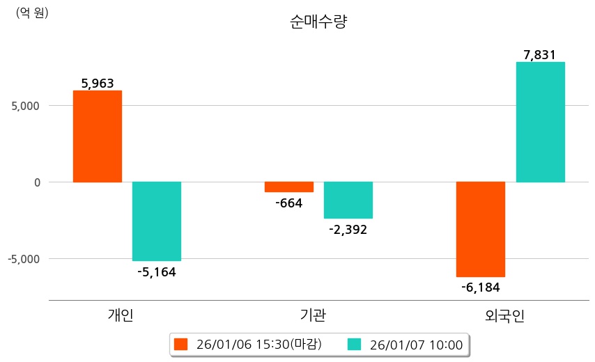 투자자별 동향을 살펴보면 기관은 2,392억 원 순매도했으며, 외국인은 7,831억 원 순매수했다. 개인은 5,164억 원 순매도했다.