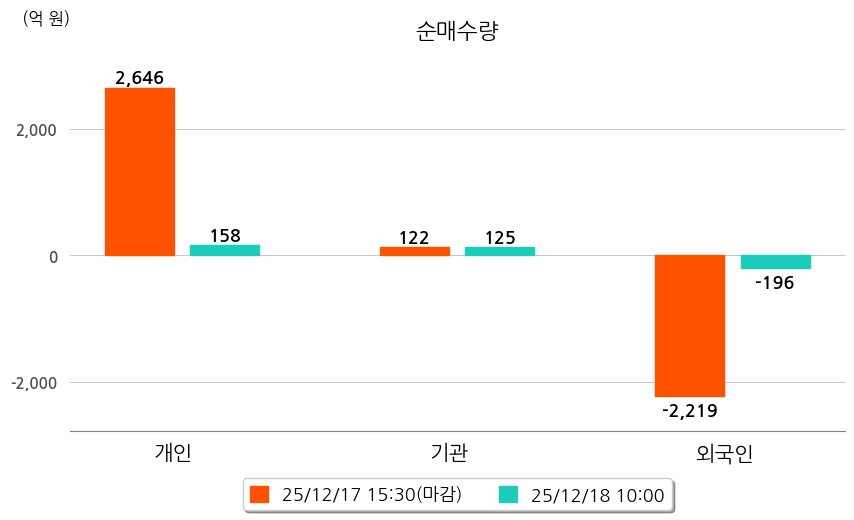 투자자별 동향을 살펴보면 기관은 125억 원 순매수했으며, 외국인은 196억 원 순매도했다. 개인은 158억 원 순매수했다.