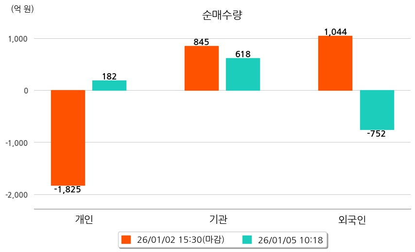투자자별 동향을 살펴보면 기관은 618억 원 순매수했으며, 외국인은 752억 원 순매도했다. 개인은 182억 원 순매수했다.