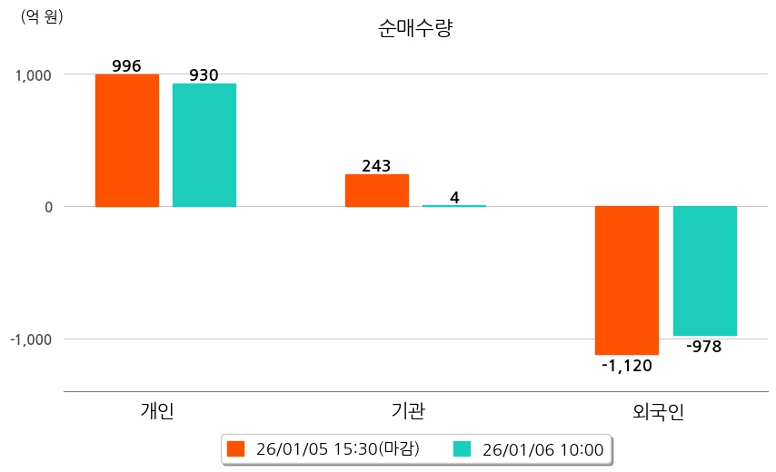 투자자별 동향을 살펴보면 기관은 4억 원 순매수했으며, 외국인은 978억 원 순매도했다. 개인은 930억 원 순매수했다.