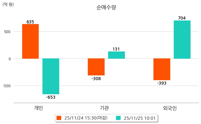 투자자별 동향을 살펴보면 기관은 131억 원 순매수했으며, 외국인은 704억 원 순매수했다. 개인은 653억 원 순매도했다.