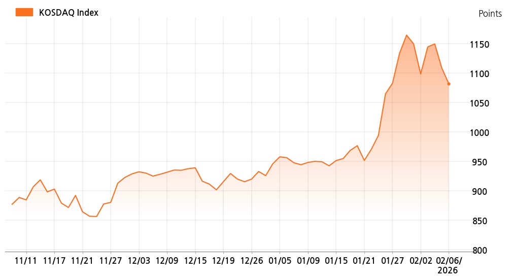 6일 오전 10시 코스닥(1,081.54p, 26.87p, -2.42%)는 개인 매도가 늘면서 하락세를 보이고 있다.