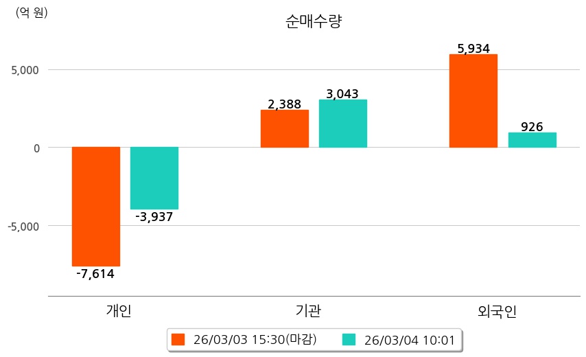투자자별 동향을 살펴보면 기관은 3,043억 원 순매수했으며, 외국인은 926억 원 순매수했다. 개인은 3,937억 원 순매도했다.