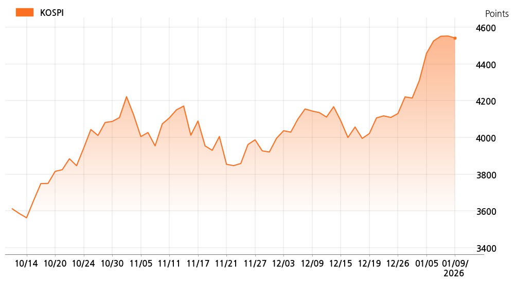 9일 오전 10시 코스피(4,541.61p, 10.76p, -0.24%)는 외국인 매도가 늘면서 하락세를 보이고 있다.